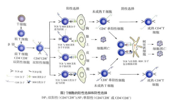 DP的pre-T細胞停止增殖,開始重排α基因,并與β鏈組裝成TCR(α:βTCR)。成功表達TCR的細胞即是未成熟T細胞。未成熟T細胞經歷陽性選擇并進一步分化為SP細胞。